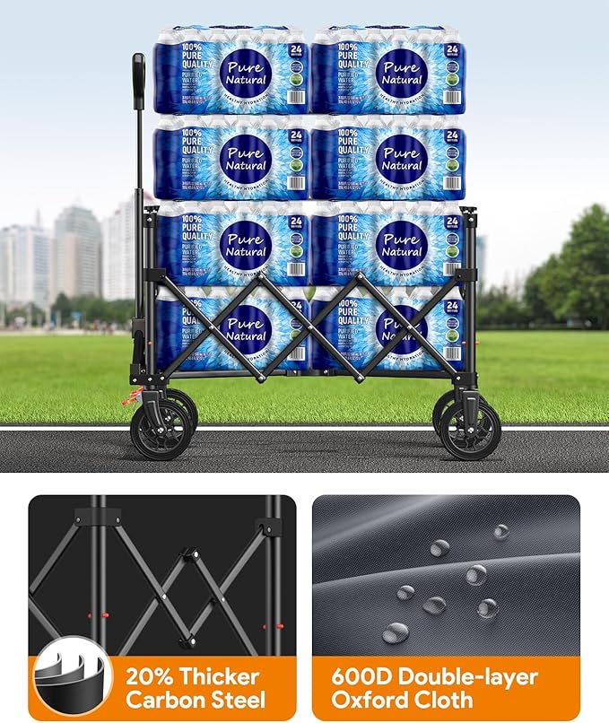 - ๐ฆ๐๐๐ฟ๐ฑ๐ & ๐ฆ๐๐ฎ๐ฏ๐น๐ฒ ๐ฆ๐๐ฟ๐๐ฐ๐๐๐ฟ๐ฒ: This wagon cart can be used simply by installing wheels. The whole frame of this collapsible wagon is made of premium high-density carbon steel. Compared with other carts, our foldable wagon has 20% thicker carbon steel, with better load-bearing capacity and stability. Double-layer 600D Oxford fabric is tear-resistant and waterproof, with low lead content and no smell. It is safe for your children and pets to touch.