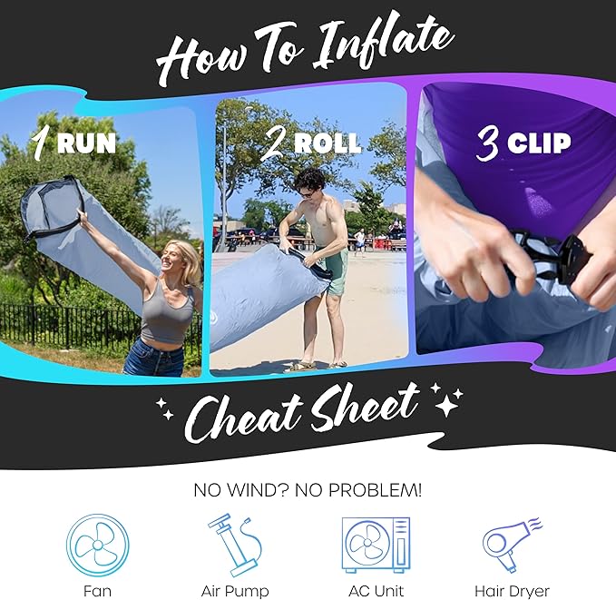 - Wind Optional Set Up: Setting up the Nevlers Periwinkle Blue Inflatable Sofa is as easy as 1-2-3! Simply run a few feet, roll it up, then clip it to have your outdoor couch ready in no time. No wind? No worries! Even if there's no breeze, you can use a fan or air pump to inflate this inflatable chair for kids & adults. When it's time to pack up, deflate & fold the portable couch into the drawstring bag for lightweight storage. No need to lug around bulky seating with our inflatable sofa bed .