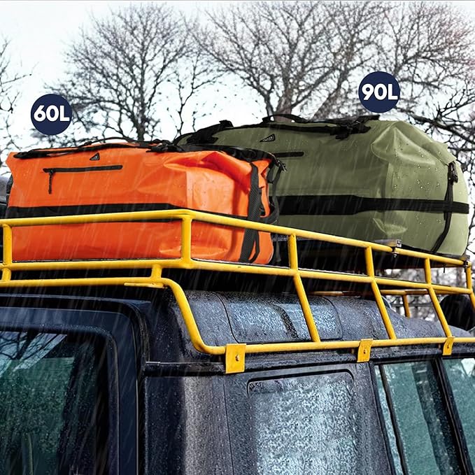 - Large Capacity with Multiple Pockets: Waterproof duffle 60L/90L with large main compartment provides plenty of room to hold your luggage/ski gear/camping essentials, 1 waterproof zipper front pocket accesses frequently needed items, 1 internal zipped pocket in the middle for storing your valuables, 2 inner mesh pockets on each side, convenient for you to organize your items