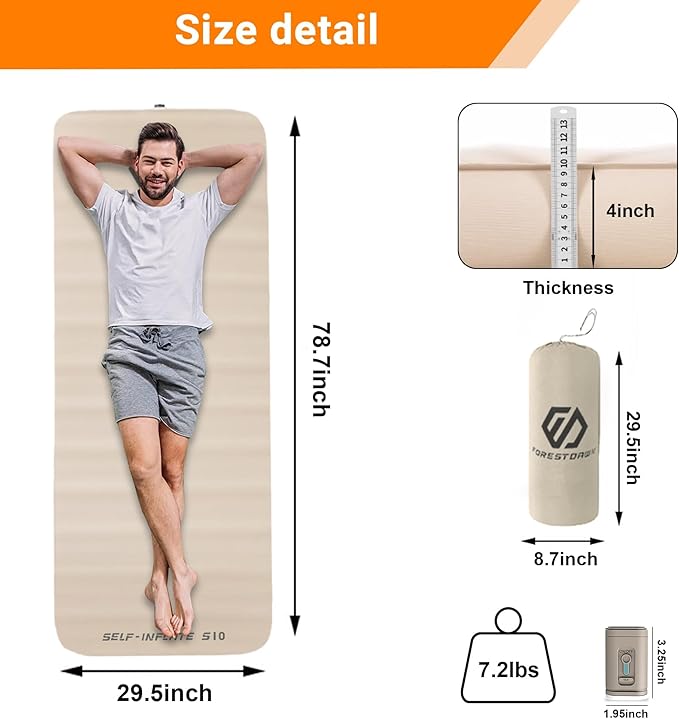 - 4-Inch Thickness for All-Night Comfort:Say goodbye to rocky ground! Measuring 78.7" L x 29.5" W (200cm x 75cm), this extra-wide camping air mattress fits all body types. The 4-inch thick foam core provides superior support, blocking cold and dampness for a bed-like sleep—whether in tents, cars, or as a guest bed.