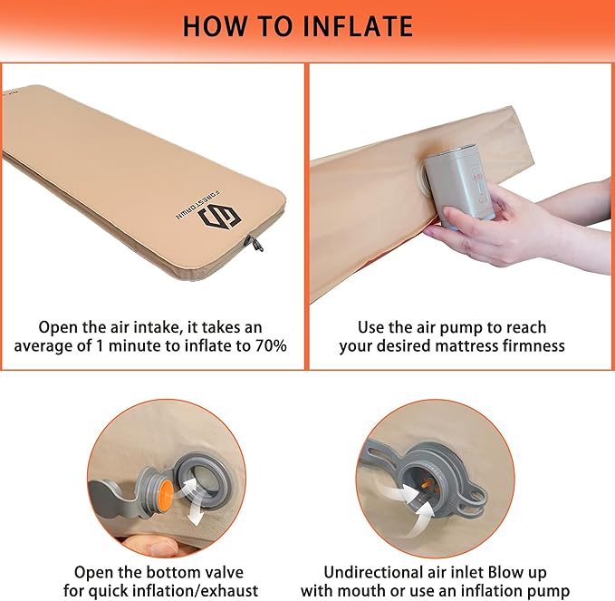 - Inflatable Camping Pads: Our self-inflating mattress can be quickly inflated by simply opening the valve, offering easy operation and effective sealing. Once the valve is fully opened, the sleeping mat will self-inflate by up to 70% within 60 seconds.
