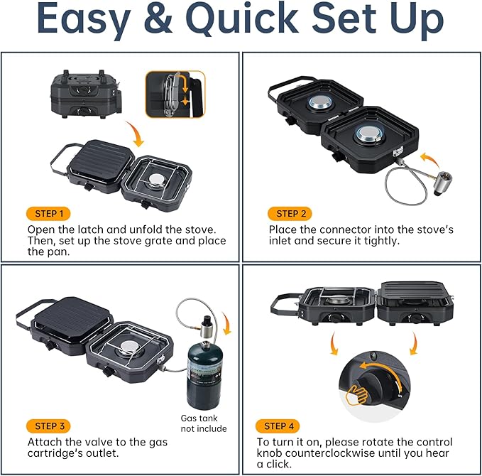 - Adjustable Control: The push-button piezo ignition simplifies lighting the burners, while the stepless adjustable heat allows you to tailor the temperature to suit all your cooking needs. Turn counterclockwise to increase the flame and clockwise to turn it off, providing you with precise control for perfect results every time.