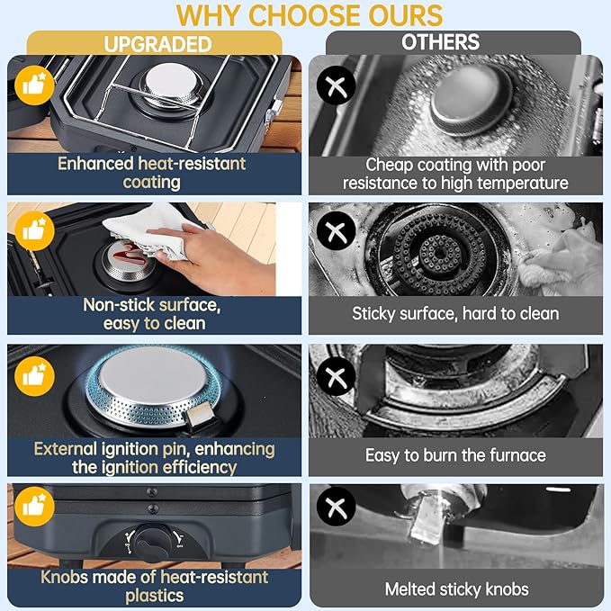 - Non-Stick Coating on Burners: The two burners are coated with a thick, non-stick layer, making them easy to clean after use and preventing food from sticking. This coating enhances both the performance and longevity of the stove, ensuring a hassle-free cooking experience every time.