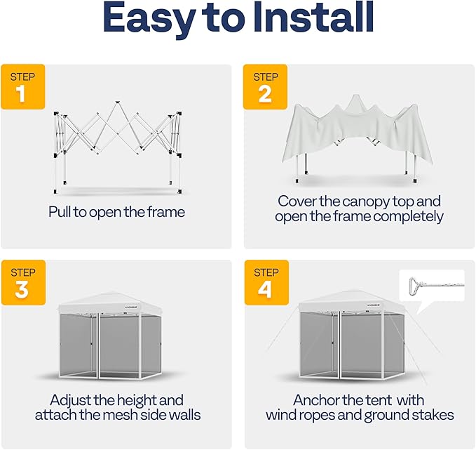 - SIMPLE INSTALLATION: The screened canopy comes with a pre-assembled pop-up frame, making it effortless for a single person to set it up without needing additional tools; Adhesive straps firmly secure the top cover to the frame, and thumb-friendly buttons simplify adjusting the canopy height; The metal feet plate, ground nails, and wind ropes are combined to keep it firmly anchored to the ground in windy conditions
