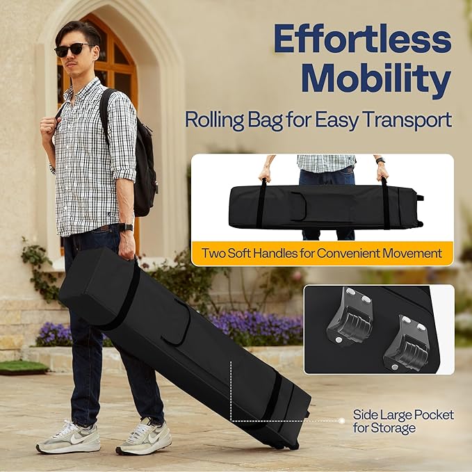 - EASY TRANSPORT: The roller bag, made of 300 x 600D Oxford cloth, comes with 2 casters, 2 robust base feet, and 2 soft handles, which is portable for your on-the-go lifestyle; Designed with practicality in mind, the storage bag features a large pocket on the side; Keep ground nails and ropes organized before installation or pack essentials like snacks, drinks, or books for your outdoor leisure; Whether camping, hiking, or beach-bound, this pop-up tent will be your ideal companion