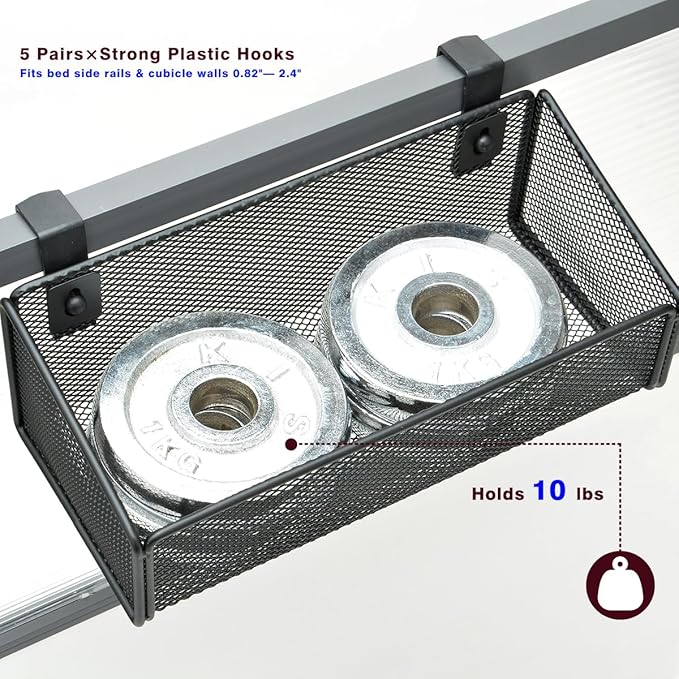 - Shelf Size: 10.4 X 3.6 X 4.7 inch (L x W x H ) Hooks Size: ① 0.8 x 2.2 Inch ② 1.1 x 2.2 inch ③ 1.3 x 2.2inch ④ 1.8 x2.2 inch ⑤ 2.4x 2.2 inch Suitable for almost all bed rails