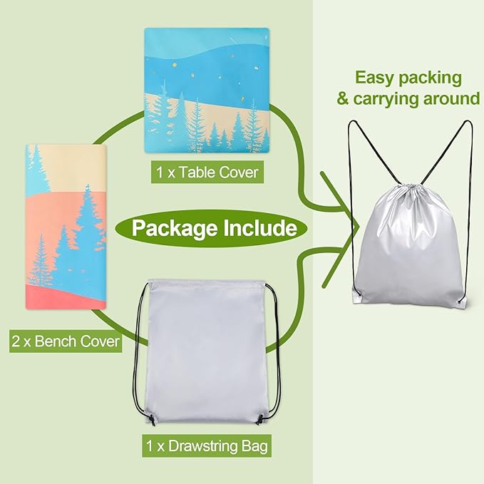 - 【PACKAGE INCLUDE】Suitable for Standard 6FT Table and Bench. The camping tablecloth 3 pcs set includes 1 x picnic table cover, 2 x bench covers, fitted for 72"x 30" rectangle tables and 72"x 12" benches. Package additional include a drawstring bag for easy storage and carring around, practical for camping, picnic, barbeque and other outdoor activities.