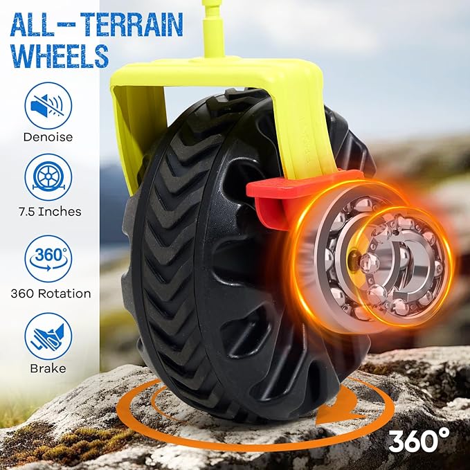 - All-Terrain Wheels: This utility wagon is equipped with 7.5-inch diameter all-terrain wheels, allowing it to navigate a variety of terrains with ease. Additionally, the front wheels are fitted with foot-operated brakes, providing reliable control and immediate stopping capability, even when the cart is fully loaded.