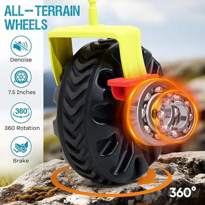 - All-Terrain Wheels: This utility wagon is equipped with 7.5-inch diameter all-terrain wheels, allowing it to navigate a variety of terrains with ease. Additionally, the front wheels are fitted with foot-operated brakes, providing reliable control and immediate stopping capability, even when the cart is fully loaded.
