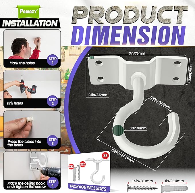 - [Easy To Install & Use] These ceiling hooks are simple to install; just drill holes in the wall, install expansion screws, and tighten the screws after installing the hooks. It can be assembled on the ceiling, brick, wood, and concrete walls, providing a perfect solution for hanging a range of items, including bird feeders, lanterns, plants, or decorations, making it a versatile accessory for any outdoor space. PACKAGE INCLUDES: 8 Ceiling hooks, 32 screws, and 32 expansion tubes.