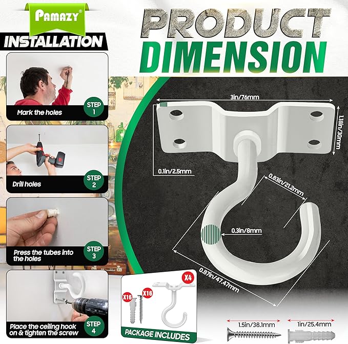 - [Easy To Install & Use] These ceiling hooks are simple to install; just drill holes in the wall, install expansion screws, and tighten the screws after installing the hooks. It can be assembled on the ceiling, brick, wood, and concrete walls, providing a perfect solution for hanging a range of items, including bird feeders, lanterns, plants, or decorations, making it a versatile accessory for any outdoor space. PACKAGE INCLUDES: 4 Ceiling hooks, 16 screws, and 16 expansion tubes.