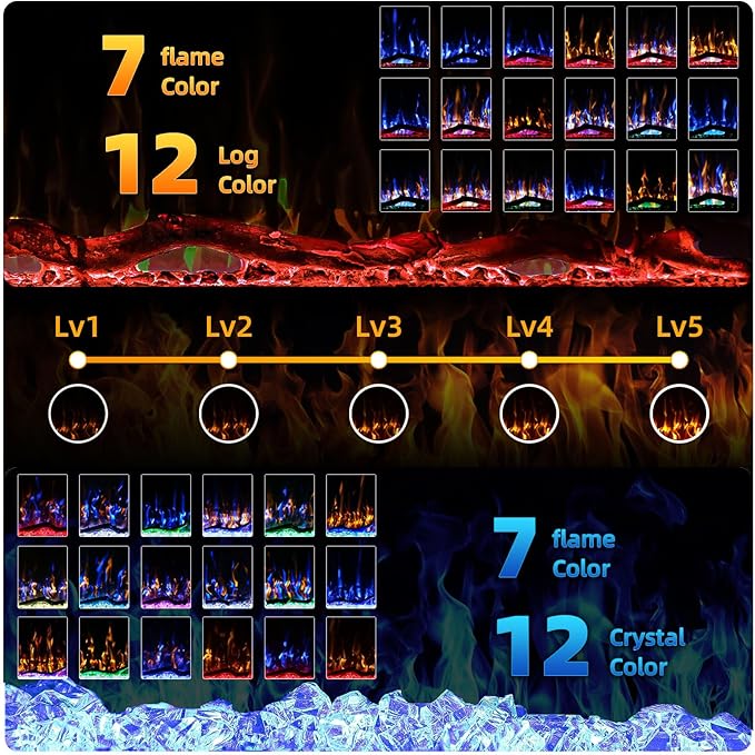 - πβ Personalized Ambiance, Lifelike Flames: Enhance your home with our deluxe electronic fireplace, offering lifelike flames that capture the essence of a real fire. Select from 5 flame brightness settings, 12 carbon bed colors, and 7 flame hues to craft your ideal ambiance.Customize your look with a large log, various decore log and crystal options, seamlessly fitting any style, whether modern or rustic. Experience comfort and charm in one beautiful package!