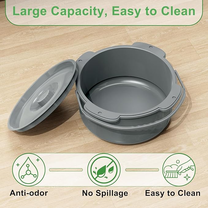 - Easy To Clean: The potty chair for adults equipped with a convenient carry bucket. Bucket with 6 Quart capacity, with lid and splash guardis; use commode liners for even quicker clean ups
