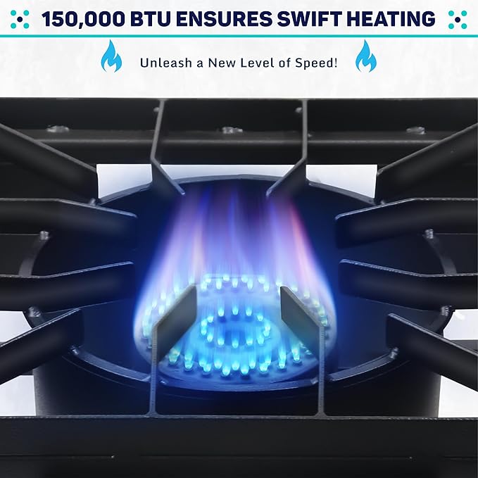 - Ultimate Heat Power: This two burner propane stove camp stove gas stove outdoor boasts 1,50,000 BTUs. This propane camping stove delivers fast, efficient cooking for quicker, more enjoyable meal prep.