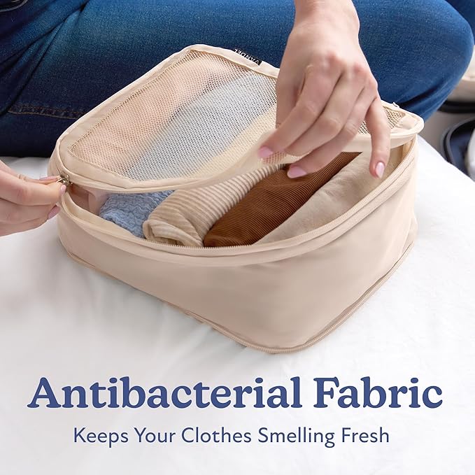 - Fabric - Made from odor-resistant fabric that’s infused with silver ions, these packing cubes for travel will always smell fresh; The breathable mesh design keeps clothing fresh and compact