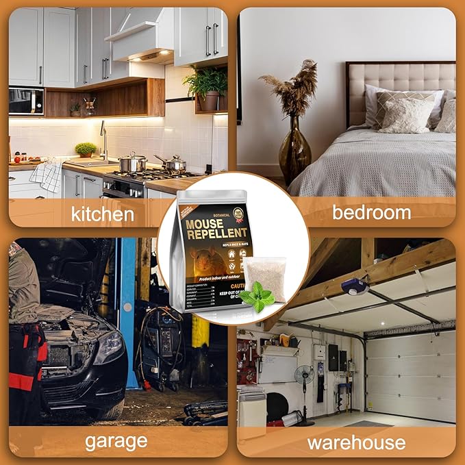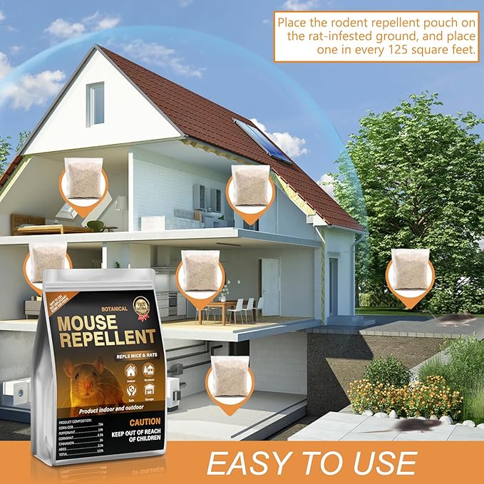 - Easy to Use: The rodent repellent is individually packaged and comes with a breathable bag, which can be hung in cabinets or on walls for specific purposes. It contains 12 bags of all-natural peppermint granules, effectively repelling rodents from all directions.