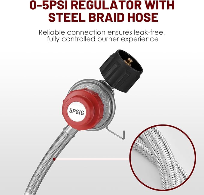 - Reliable Gas Connector—Equipped with 47-inch steel braided hose & 5psi regulator, ensure a reliable and leak-free fully controlled burner experience.