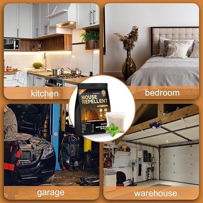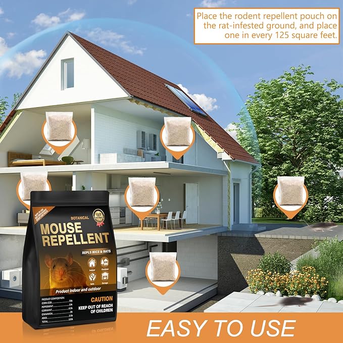 - Easy to Use: The rodent repellent is individually packaged and comes with a breathable bag, which can be hung in cabinets or on walls for specific purposes. It contains 12 bags of all-natural peppermint granules, effectively repelling rodents from all directions.