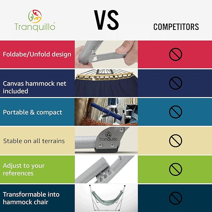 - SMART 30s FOLD / UNFOLD 10s ADJUST STAND: No assembly needed, simply unfold the hammock and click it in place. Our Hammock Stand provides a sturdy foundation, allowing you to create your personal relaxation oasis anywhere. Tranquillo Hammock features a unique design that effortlessly turns into a hammock swing chair stand for endless utilizations