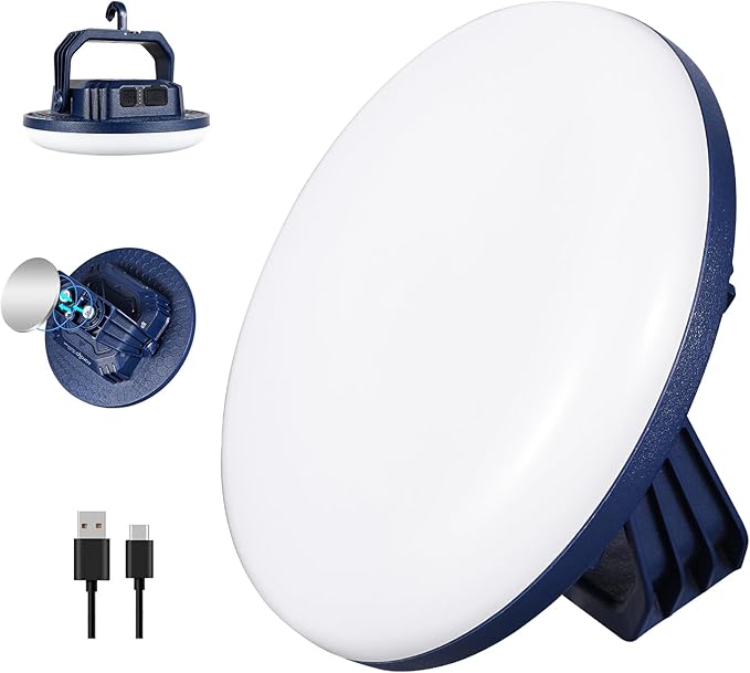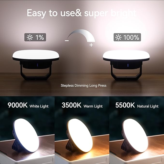- [3 lighting modes & Stepless Dimming]: Our camping lights is dimmable, Short press to switch between 3 lighting modes (3500K/5500K/9000K), Long press to adjust brightness, providing you with the perfect lighting for any occasion, whether it's a cozy campfire setting or a bright emergency situation.