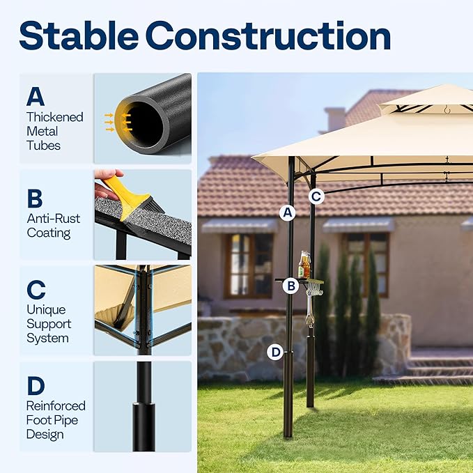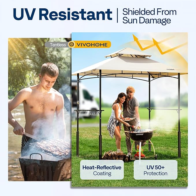 - HEAVY-DUTY STEEL FRAME, RUST-RESISTANT: The VIVOHOME Grill Gazebo Canopy features a durable powder-coated steel frame that is both rust-resistant and built to last; The frame?™s reinforced construction ensures your gazebo stands firm and secure, even in windy conditions; To further enhance stability, the gazebo includes reinforced, thickened feet, offering extra support to withstand changing weather; Whether in sun or wind, you can rely on the sturdy frame for long-lasting use