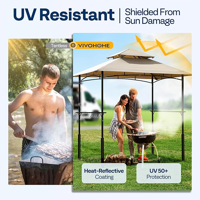 - SPACIOUS & SHADED COMFORT: The VIVOHOME Grill Gazebo Canopy (8' x 5' x 8.2') provides plenty of space for 6-8 people, keeping your BBQ gatherings cool and shaded for your BBQ gatherings. With its wide coverage, it keeps everyone cool and comfortable, whether you?™re grilling or socializing; Designed to protect both your grill and guests, it?™s the perfect addition to enhance your outdoor cooking and entertaining experience