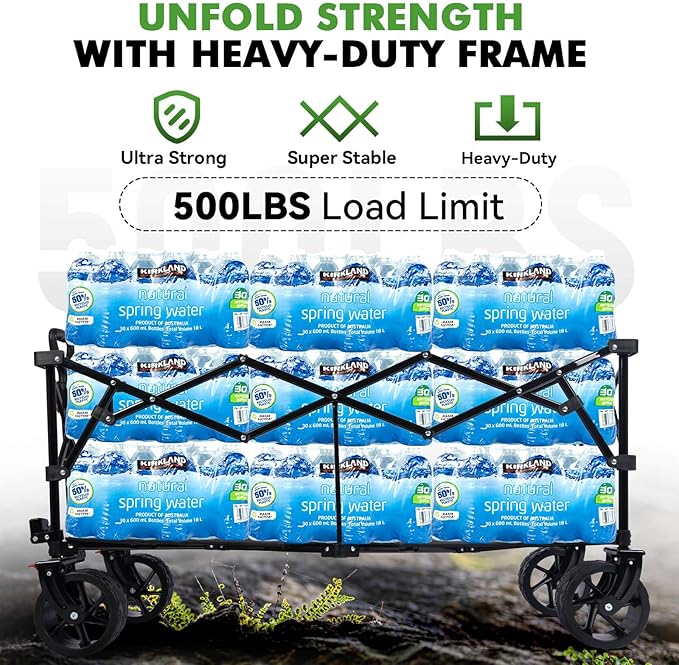 - HEAVY-DUTY PERFORMANCE YOU CAN TRUST: Engineered with a reinforced steel frame, our utility wagon supports an impressive load of up to 500 lbs. It's sturdy enough to hold 3 adult men without a hitch. Whether you're hauling groceries, sports gear, or gardening supplies, rest assured this grocery wagon can handle it effortlessly, making it your reliable companion for any heavy lifting.