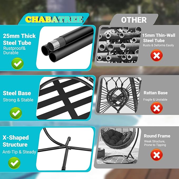 - 【Sturdy and Durable】:This egg chair with Stand is made of durable waterproof wicker and supported by a sturdy heavy-duty aluminum steel frame, with a weight capacity of up to 350 pounds, ensuring years of use.