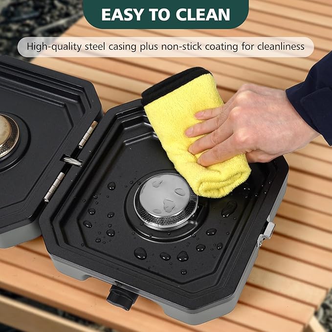 - Durable Stainless Steel: Upgraded steel handle is sturdy, you can cook various foods like eggs, burgers, and veggies on the iron plate, while making coffee on the side burner, wonderful for camping and outdoor events