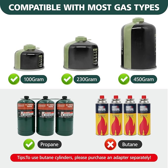 - Upgraded High Power Stove: Ours dual burner stove offers 17,200 BTUs for quick heating. It works with Isobutane or Hybrid Isobutane canisters, and you can use propane with a separate adapter, ideal for cooking simple meals