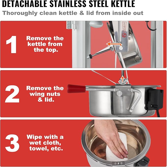 - Durable Structure, Effortless Cleaning: This commercial popcorn machine comprises a cold rolled steel frame and tempered glass panels to withstand frequent use. The doors with magnetic latch provides quick access and enhances the appearance of the popcorn inside. The printed graphics on its top may also catch some hungry stares. Besides, the wing nuts on the kettle allow you to detach its lid easily and clean its interior thoroughly. Hassle-free cleaning will extend the machine's service life.