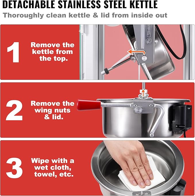 - Durable Structure, Effortless Cleaning: This commercial popcorn machine comprises a cold rolled steel frame and tempered glass panels to withstand frequent use. The doors with magnetic latch provides quick access and enhances the appearance of the popcorn inside. The printed graphics on its top may also catch some hungry stares. Besides, the wing nuts on the kettle allow you to detach its lid easily and clean its interior thoroughly. Hassle-free cleaning will extend the machine's service life.