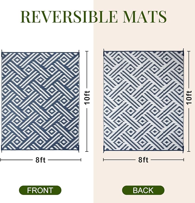 OPPODREAM Outdoor Rug 8x10 Patio Waterproof, Large Outdoor Plastic Straw Rug, Reversible Out Door Carpet for Camping, Deck, Rv, 8 x 10 Area Carpet for Balcony, Porch, Backyard, White and Navy Blue