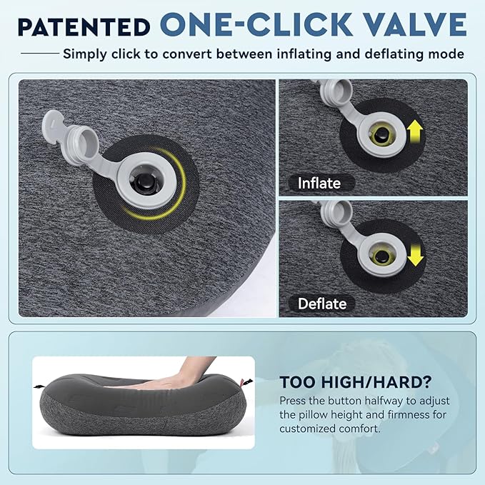 - ONE CLICK, ADVENTURE MADE SIMPLE - Simplify your camping setup with our sleeping bag pillow’s innovative one-click valve system, designed for effortless inflation and deflation. No more fumbling with complex mechanisms - adjust the compact travel pillow's firmness with a simple press of a button, and focus on what truly matters: enjoying the great outdoors. Efficiency meets convenience with our intuitive design!