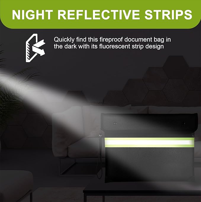 - ⛱️【360°Top Fireproof and Waterproof】The fireproof document bag is sewn with flame-retardant thread and fire-resistant hemming to prevent flames from damaging the fireproof bag from the edges, and it has a unique double-sided two-color reflective strip, allowing you to easily find it in the dark.The sealed waterproof zipper, combined with the flap design, can withstand the high-speed spray of the fire hose and prevent fire, heat, and smoke from entering the fireproof bag.