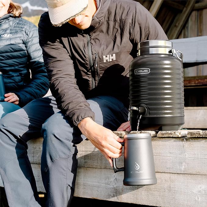 IDEUS Insulated Beverage Dispenser 5.2L, All-in-one for Camping Vacuum Double-Wall Stainless Steel Water Cooler Coffee Carafe Jug Leakproof Drink Container with Handle, Spigot & Stand (Black)