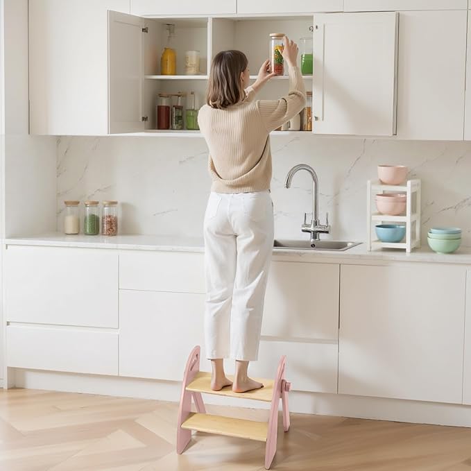 Wooden 2 Step Stool for Kids Bathroom Sink Foldable Anti-Slip 2-Step for Toilet Potty Training, Child Stepping Stool for Kitchen Nursery Bedroom, Sturdy Non Slip Adult Stool for Closet Pink