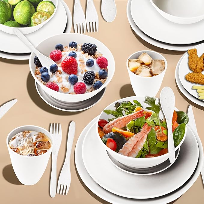 - โฆใ๐ฃ๐ฎ๐ฐ๐ธ๐ฎ๐ด๐ฒ ๐๐ป๐๐ถ๐ฑ๐ฒใ - Wrova 64-Piece Service for 8 Dinnerware Set contains 8pcs 10inches wheat straw plates, 8pcs 9inches wheat straw plates, 8pcs 6inches wheat straw plates,8pcs 26oz wheat straw bowls,8pcs 12oz wheat straw cups and 24pcs cutlery as well. All of them are unbreakable,bpa and lead free,lightweight and easy to clean.