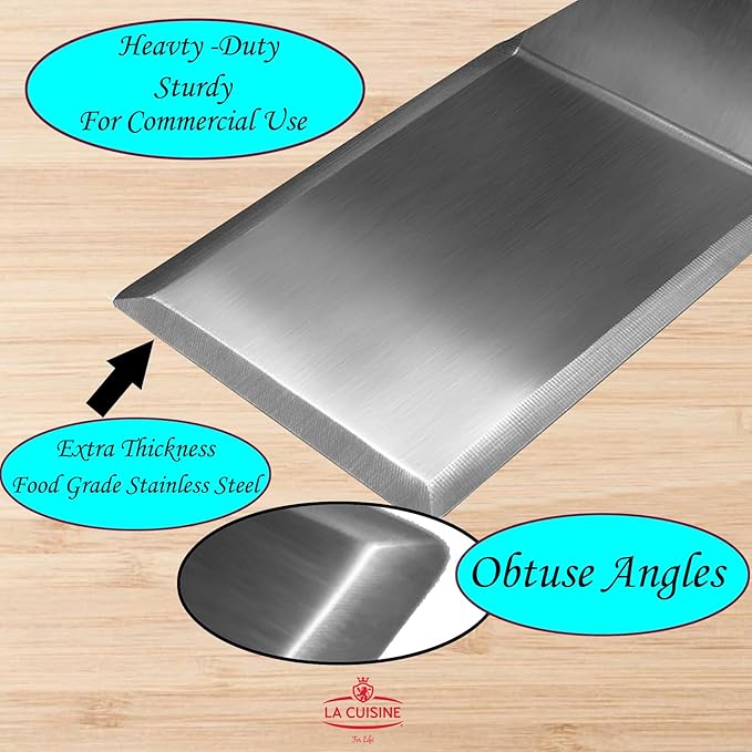 - Made of heavy-duty food-grade stainless steel with heat-resistant, and non-slip solid wood handle, is a versatile kitchen tool with a broad, flat surface that makes cooking and serving various foods much easier.
