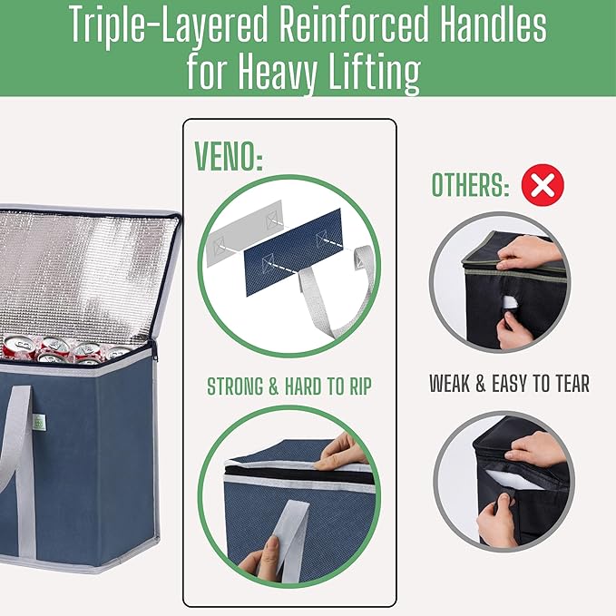 VENO 3 Pack Cooler Bag Insulated Reusable Grocery Shopping Bag, Food Delivery, Heavy Duty, Large Size, Durable Handles, Double Zippers, Lid, Collapsible (Dark Blue, 3 Pack)