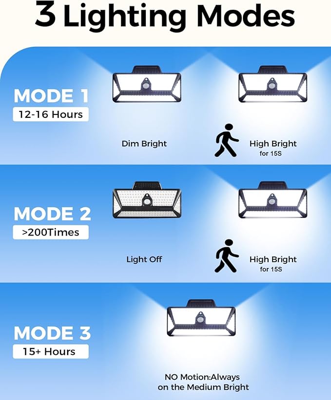 - 【Remote Control & 3 Modes with Motion Sensor】 The solar motion sensor outdoor lights have 3 lighting modes: (1) Strong light sensor mode and dim light mode. (2) Strong light sensor (3) Keep medium brightness, which can meet your different needs. The remote control makes it a breeze to switch modes. And if you misplace the remote, the little white switch on the light works too