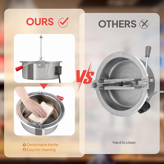 - ✔ Large Production & Easy Cleaning: 10-ounce kettle can make up to 4 gallons of popcorn per batch to satisfy large demand. Detachable design for easy cleaning after use. NOTE: Please allow at least 1 hour for the kettle to cool down before cleaning