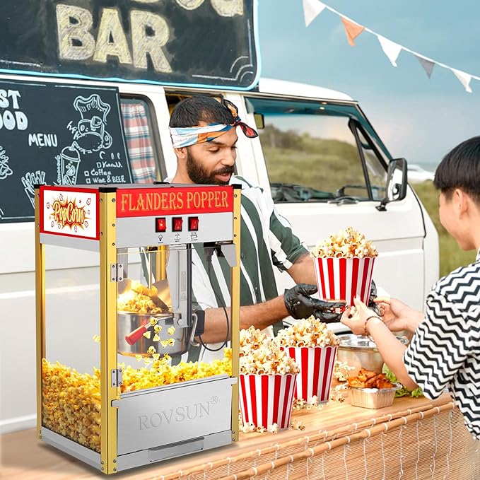- ✔ Comes with Accessories: The commercial popcorn machine comes with 1 popcorn scoop, 1 oil measuring spoon, 1 corn measuring spoon, 30 popcorn bags, 3 popcorn cups and 1 power shaker