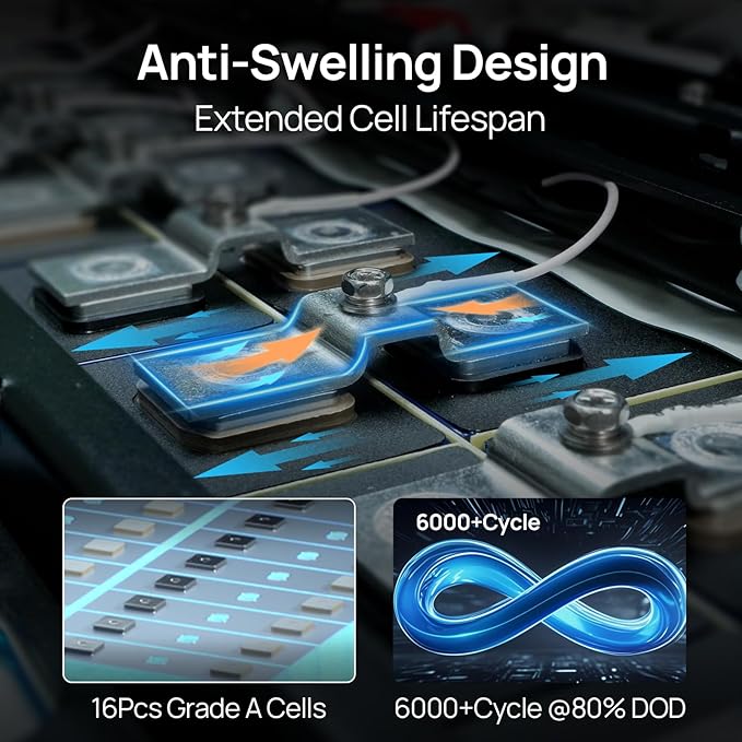 - Robust Safety Features: This 48V LiFePO4 battery is built for safety with a durable full-metal shell and a 100A BMS that provides multiple layers of protection. It also integrates a 125A air switch and a battery power switch to ensure your system stays safe and secure under any conditions.