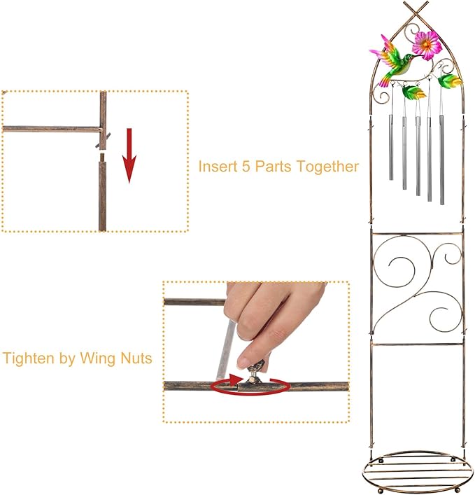 - Elegant Design: This plant pot stand features a charming back trellis for climbing plants and a robust bottom holder for flower pots. Decorated with vivid colorful hummingbird; flower and wind chime. Make it to be a beautiful and functional addition to garden