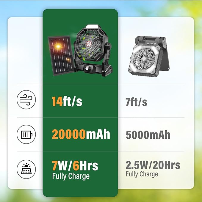 - ๐ใ7W High Efficiency Solar Panelใ- The solar panel is covered by monocrystalline silicon solar cells, the solar panel adopts multi-layered cell technology to generate energy from the sunlight and perform better with higher conversion efficiency that up to 23% than other conventional panels, and it only takes 6 hours to fully charge the 20000mAh camping fan.