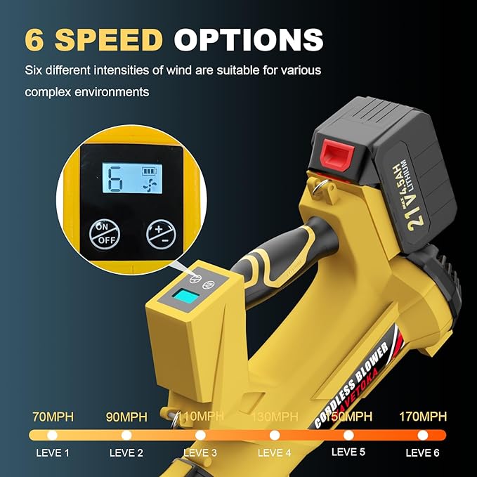 - 6 SPEED MODES + DOUBLE TUBE DESIGN: Electric leaf blower cordlesshas 6 adjustable speeds with dismantle hose and nozzle, making this sopladoras de bateria very flexible and versatile. The battery leaf blower has a digital display screen that allows you to clearly understand the battery level and wind speed level at all times. Whether clearing light debris or tackling heavy leaf piles, the blowers for lawn care cordless for lawn care can easily switch speeds to suit the job.