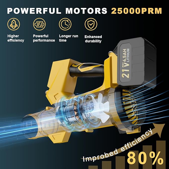 - POWERFUL BRUSHLESS MOTOR & ADVANCED AXIAL FLOW TECHNOLOGY: WAVETOKA 21V cordless leaf blower features an advanced brushless motor and axial-flow fan technology to maximize airflow output, producing wind speeds up to 540 CFM/170 MPH. Unlike traditional blower designs, axial flow technology ensures a steady, focused stream of air that maximizes efficiency and minimizes power loss. Whether you're tidying up your yard or driveway, the leaf blower makes your cleaning job more efficient and easier.