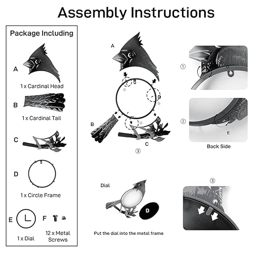 - Easy to Assemble: The cardinal indoor outdoor thermometer can be easily assembled without the help of tools. Match the round metal frame with the holes on the metal corners, tighten them with screws, and finally put in the 9.8-inch dial. Then hang it on the wall to decorate the room