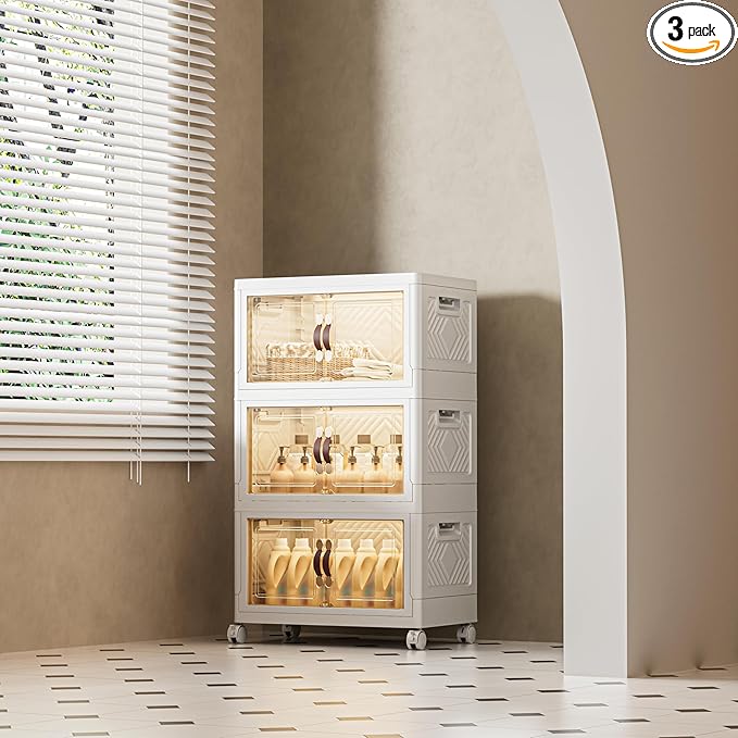 108 QT / 27 Gal Stackable Storage Bins (1 Lid) w/Wheels & Magnetic Doors, Collapsible Plastic Organizer Cabinet for Closet Office Garage - White Storage Containers